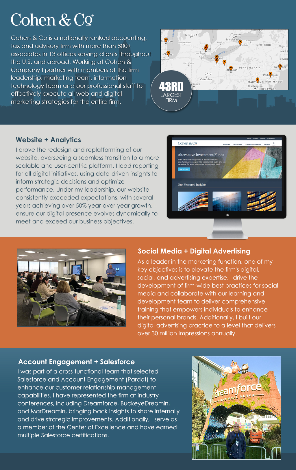 As a member of the marketing management team at Cohen & Co, I lead the firm’s digital strategy across web, social media, email marketing, and digital advertising, driving consistent year-over-year growth. I spearheaded a website rebrand, directed the transition to a new marketing automation system, and launched multiple digital initiatives. Notable achievements include a 148% increase in website traffic, a 30% reduction in technical SEO issues, and a 438% growth in email marketing, while maintaining a 35% open rate. I’ve expanded our social media presence with an 89% increase in LinkedIn followers and a 174% rise in impressions, reaching over 1 million annually. Additionally, I built our digital advertising efforts from the ground up, delivering 34 million brand impressions annually, continuously reducing CPM rates, and refining audience targeting. Beyond strategy and execution, I mentor junior staff, collaborate across departments, and lead digital marketing training firm-wide.
