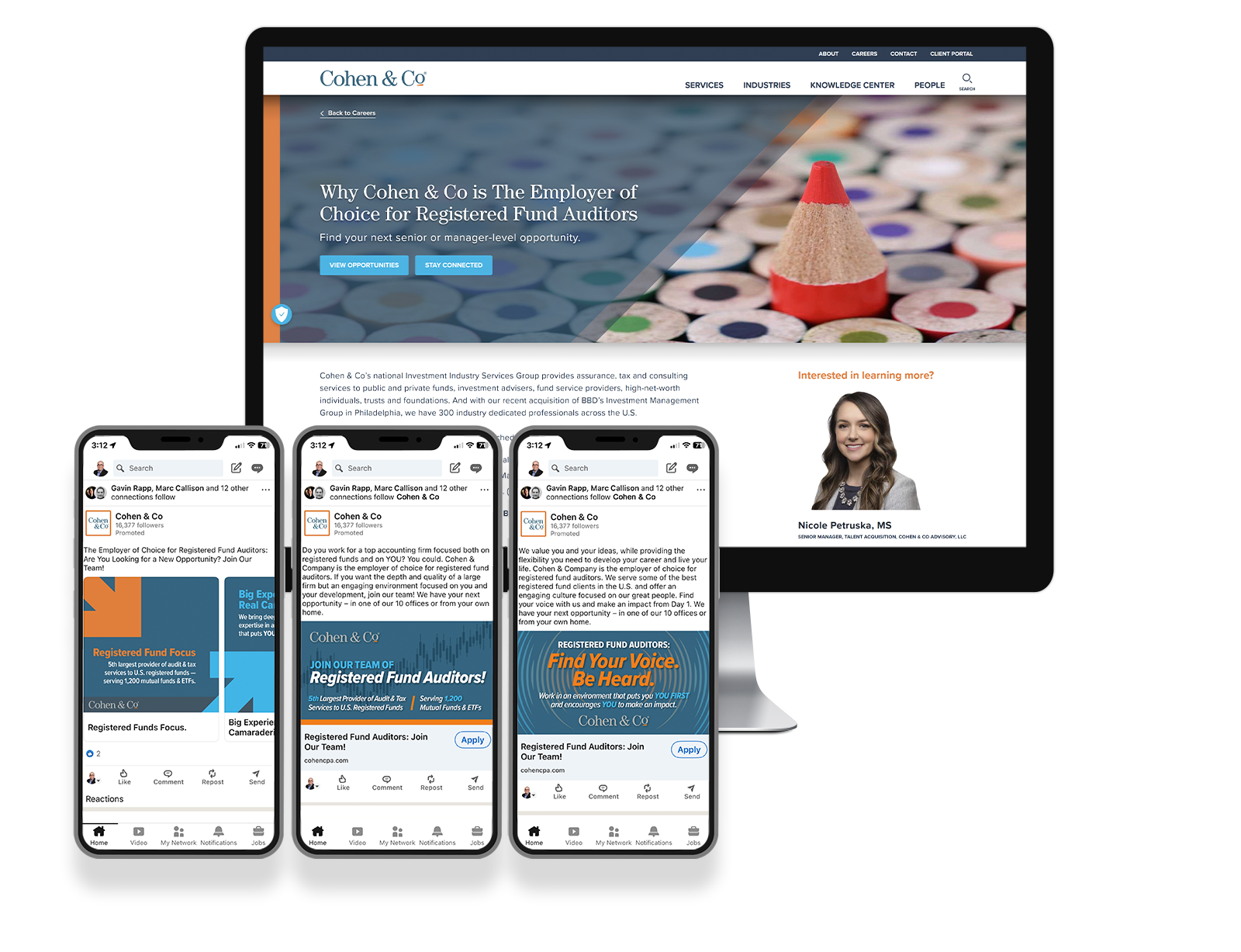 I led a strategic recruitment campaign to attract top talent in the competitive registered funds space. We showcased our firm’s culture, expertise, and unique advantages by targeting professionals from eight national firms. Our LinkedIn paid media campaign reached over 6,200 individuals and generated over 75,000 impressions. The effort resulted in over 200 applications and 35 accepted offers. This campaign earned the firm the Association for Accounting Marketing’s (AAM) 2023 Marketing Achievement Award for ‘Marketing and PR – Recruiting Campaign.