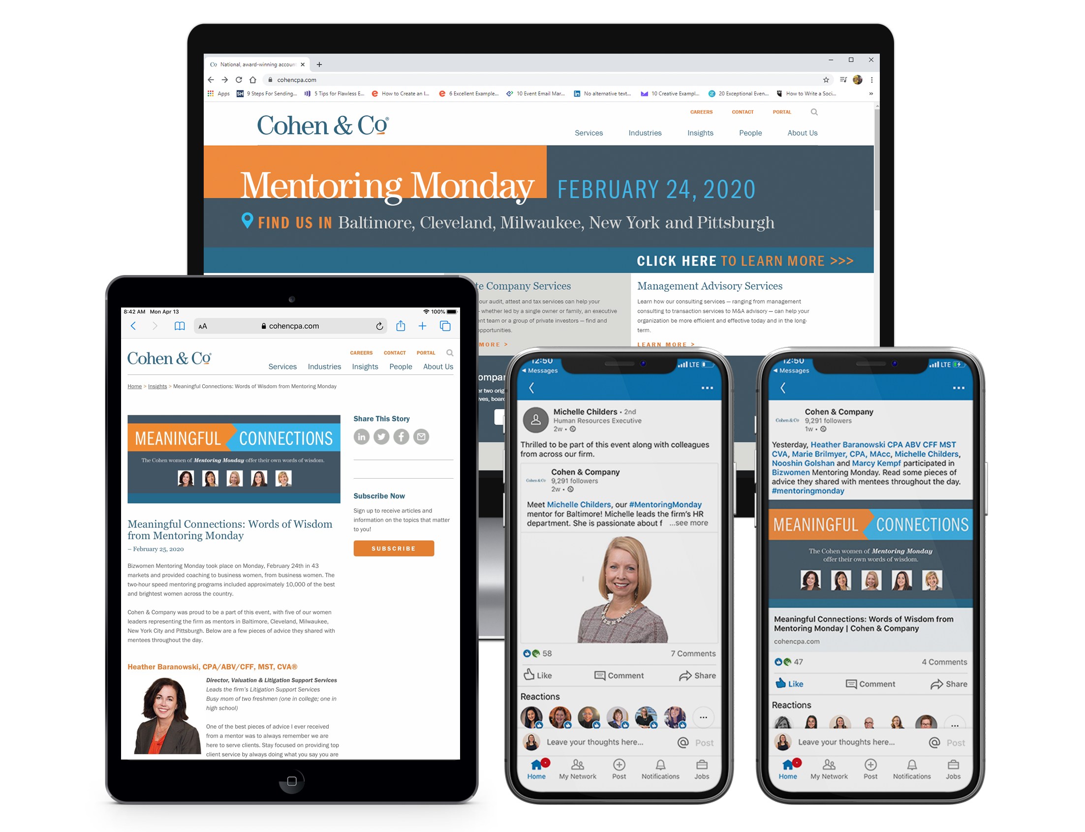 The Mentoring Monday campaign was one of the first integrated efforts I led at the firm. By strategically combining our participation, regional paid media, and website promotion, the initiative generated a significant surge in social media impressions, helping the firm achieve its highest-ever monthly total. Additionally, we saw record-breaking website traffic, with page views increasing by 44.77% year-over-year.