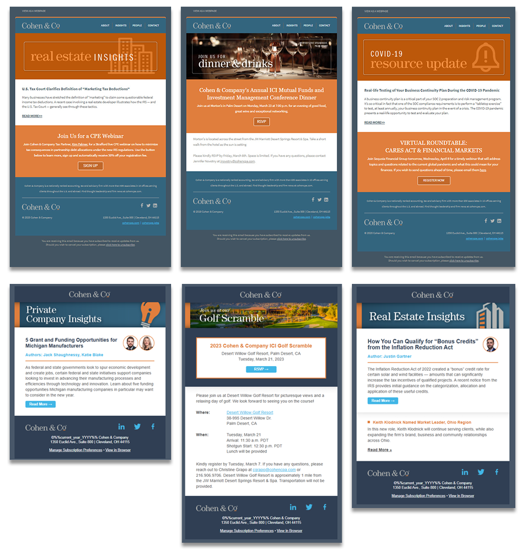 I led the firm’s transition from ClickDimensions to Salesforce Account Engagement (Pardot) along with standardization of our email marketing program to enhance efficiency, branding consistency, and overall performance. In 2023, we updated the designs of our emails to create a more consistent look with our newly launched website. These efforts to improve our email program have resulted in a 438% increase in email marketing reach while maintaining a strong 35% open rate.