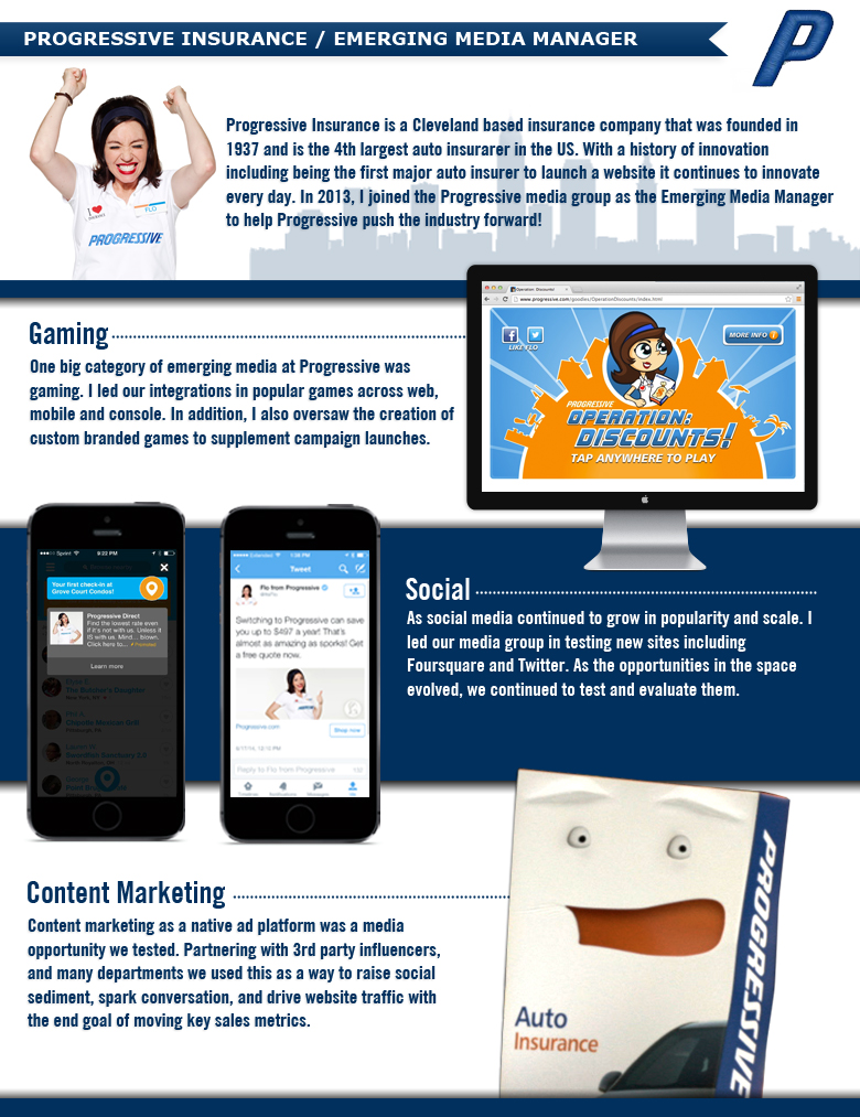 As an Emerging Media Manager at Progressive Insurance, I led a $15M media strategy focused on mobile, gaming, social, and content marketing to drive customer acquisition. I spearheaded high-value partnerships with industry leaders like Electronic Arts and Zynga, integrating Progressive into web, mobile, and console experiences. I optimized campaign effectiveness and performance reporting by leveraging insights from research firms such as comScore and InsightExpress. Additionally, I managed the development of custom-branded games and directed media efforts for the Snapshot usage-based insurance product. I represented Progressive at premier industry events, including CES and E3, and strategic summits with Amazon, Facebook, Google, Microsoft, and Twitter.