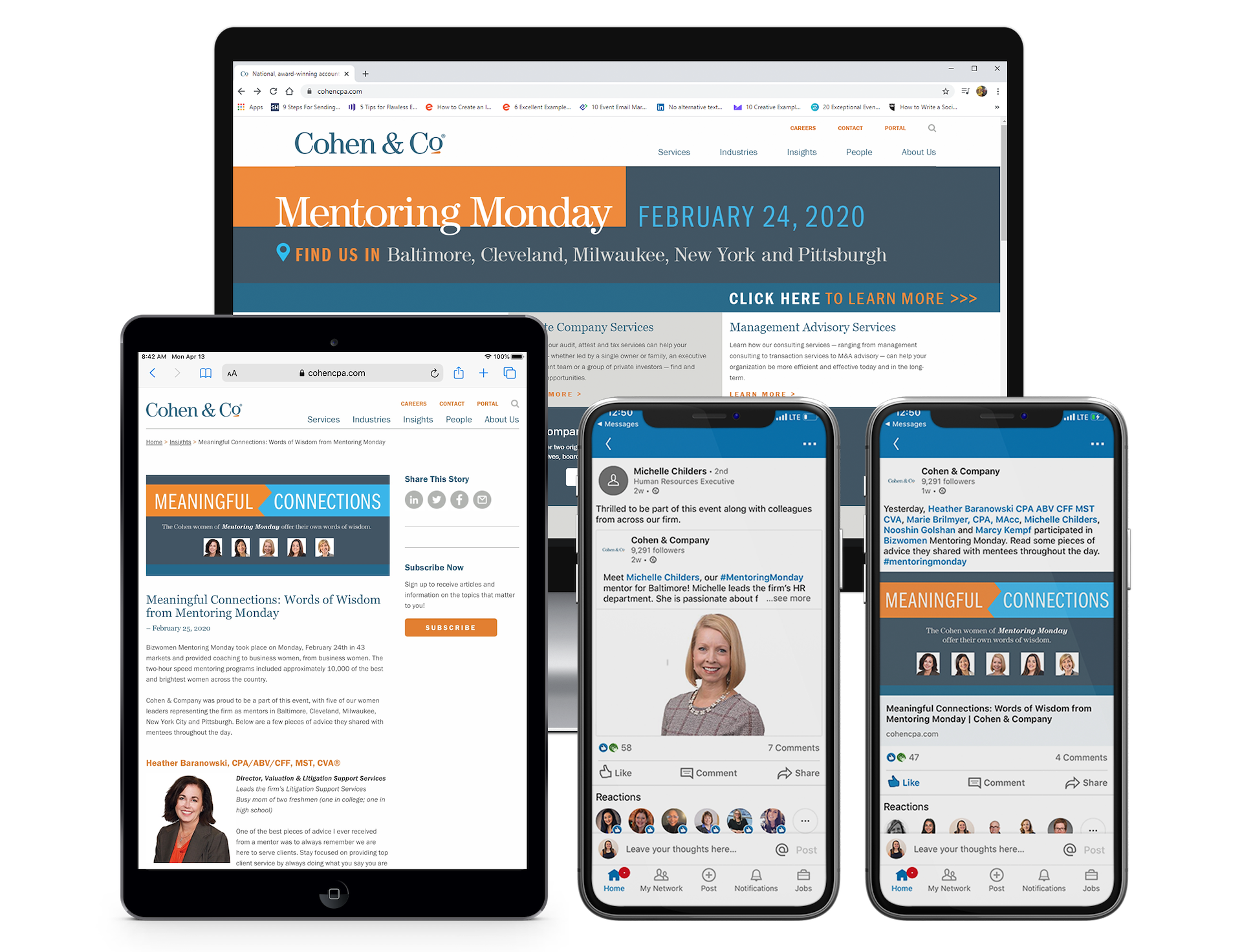 The Mentoring Monday campaign was one of the first integrated efforts I led at the firm. By strategically combining our participation, regional paid media, and website promotion, the initiative generated a significant surge in social media impressions, helping the firm achieve its highest-ever monthly total. Additionally, we saw record-breaking website traffic, with page views increasing by 44.77% year-over-year.